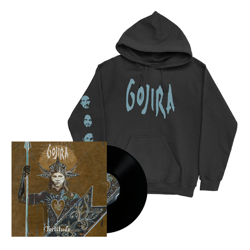 The Fortitude Black vinyl bundled with the Gojira 'Fortitude Faces Hoodie' features a light blue Gojira logo on the front and 'Fortitude' written on the back. The right sleeve features the faces of the band members. This design is printed on a unisex black hoodie.