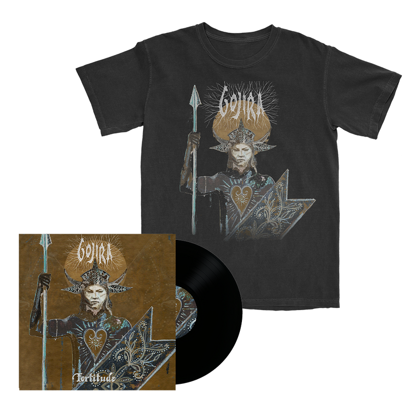 The Fortitude Black vinyl bundled with the Gojira 'Knight Night T-Shirt' features the 'Fortitude' album artwork printed on the front of a black unisex t-shirt.